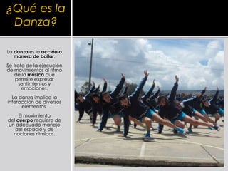 El documento habla sobre el grupo de danzas "Dancing Stars" del E.N.S.L.A.P. Tunja. Explica que la danza implica la expresión de emociones a través del movimiento rítmico del cuerpo. Luego describe tres tipos de danzas: tradicionales/folclóricas, clásicas y modernas. Finalmente, señala que practicar danza desarrolla habilidades físicas, mentales y artísticas además de ser una forma de expresión.
