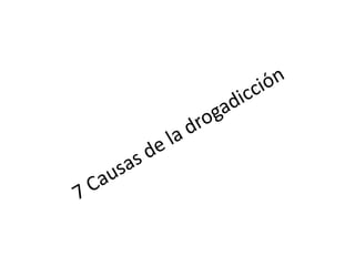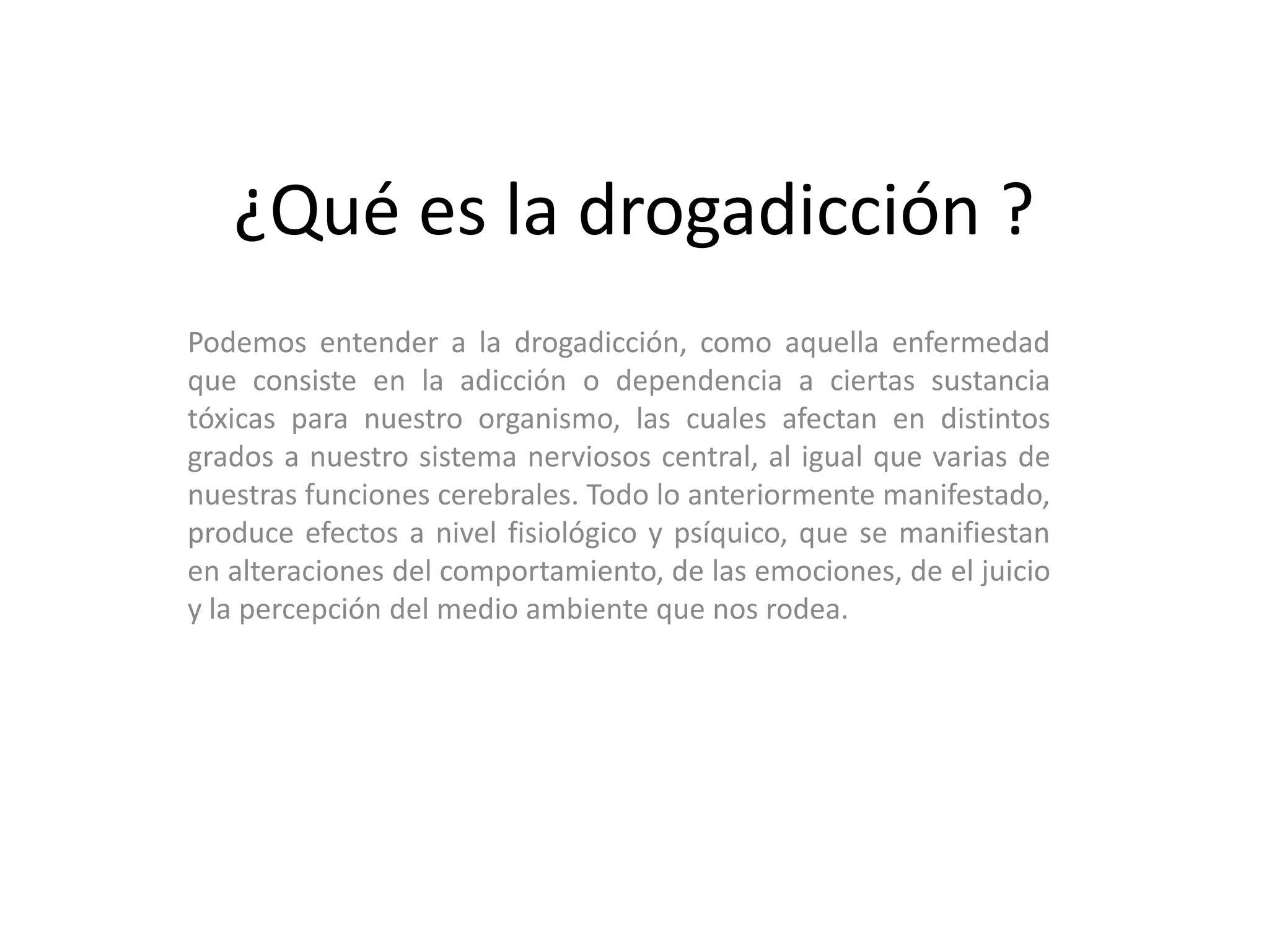 La drogadicción se define como una enfermedad causada por la adicción o dependencia a sustancias tóxicas que afectan el sistema nervioso central y varias funciones cerebrales, produciendo alteraciones en el comportamiento, las emociones, el juicio y la percepción. Algunas causas comunes de la drogadicción son la curiosidad, el uso indebido de medicamentos recetados, el escape del estrés y los problemas a través de las drogas, y la exposición a otros drogadictos.