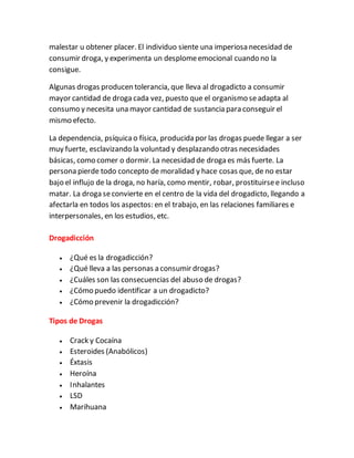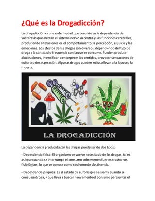 La drogadicción es una enfermedad causada por la dependencia a sustancias que afectan el sistema nervioso central y las funciones cerebrales, produciendo alteraciones en el comportamiento, la percepción, el juicio y las emociones. Esta dependencia puede ser física, causando síntomas de abstinencia cuando se deja de consumir la droga, o psíquica, generando un fuerte deseo de consumir para evitar el malestar emocional. Con el tiempo, el cuerpo se adapta y requiere dosis mayores de la droga para lograr