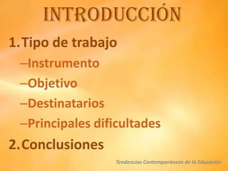 El documento describe los resultados de una encuesta sobre conceptos de educación. La mayoría de los encuestados considera que la educación es un proceso de desarrollo integral de la persona. También opinan que los maestros deben usar métodos adaptados a cada estudiante y que la falta de motivación de los estudiantes es una causa principal de la crisis educativa actual.