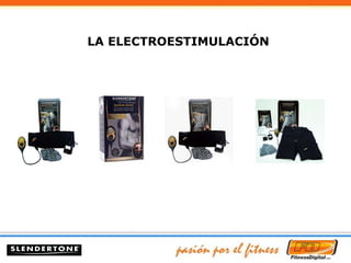 El documento explica cómo funciona la electroestimulación muscular (EMS), que permite la contracción de los músculos mediante impulsos eléctricos dirigidos a los nervios motores. Se detalla el uso de cinturones de tonificación Slendertone que mejoran la fuerza y resistencia abdominal, y se presentan resultados de un estudio sobre su efectividad. Se recomiendan sesiones regulares y ajustes de intensidad para optimizar resultados.