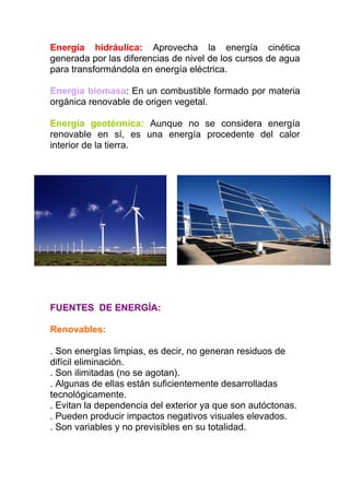 La energía es la capacidad de producir un cambio como iniciar o alterar un movimiento o variar la temperatura. A lo largo de la historia, la humanidad ha utilizado diferentes fuentes de energía como el fuego, la leña, el carbón mineral y actualmente las energías renovables como la solar, eólica e hidráulica y no renovables como el carbón, petróleo y gas natural. Las energías renovables son limpias e ilimitadas mientras que las no renovables generan emisiones, son limitadas y provocan dependencia exterior.