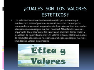 Los valores éticos son estructuras mentales que mantenemos para nuestra supervivencia y bienestar. Pueden ser valores finales o instrumentales. Los valores éticos también pueden ser públicos o privados. La justicia y el bien son valores fundamentales, mientras que otros valores concretizan estos. La belleza es un concepto subjetivo que depende de factores culturales e históricos.
