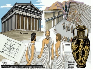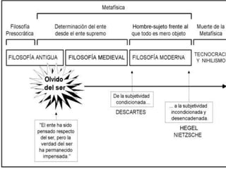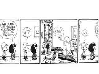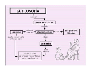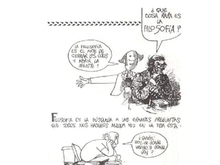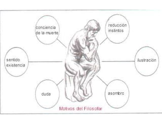 Este documento explora la naturaleza y el propósito de la filosofía. Se origina en la antigua Grecia como una transición del pensamiento mítico al uso de la razón para comprender la realidad. La filosofía estudia problemas fundamentales sobre la existencia, el conocimiento y la ética a través de un método racional en lugar de mitos. Tiene como objetivo indagar sobre los misterios de la vida y cuestionar situaciones límite para ver más allá de lo inmediato.
