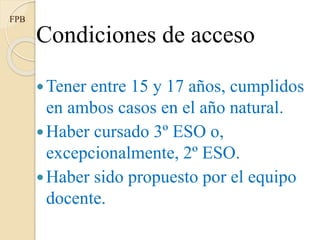 La Formación Profesional Básica (FPB) dura dos años con un total de 2000 horas. Se puede acceder a ella a los 15-17 años tras cursar 3o de ESO. Ofrece un título profesional básico y permite acceder directamente a un ciclo de grado medio o obtener el título de graduado en ESO si se supera una evaluación final. Incluye módulos comunes, profesionales y prácticas en empresas. El documento proporciona detalles sobre tres programas de FPB en concreto.