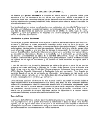 La gestión documental es el conjunto de normas y prácticas para administrar documentos en una