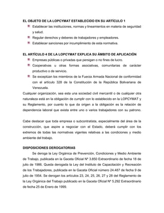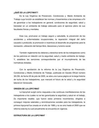 La Ley Orgánica de Prevención, Condiciones y Medio Ambiente de Trabajo (LOPCYMAT) establece normas y lineamientos para garantizar condiciones de seguridad, salud y bienestar de los trabajadores. Promueve un trabajo seguro y saludable, prevención de accidentes y enfermedades laborales, y reglamenta deberes y derechos de trabajadores y empleadores con respecto a la seguridad y medio ambiente laboral.