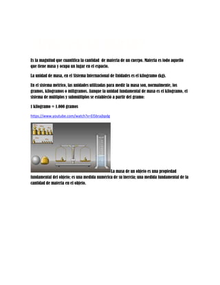 La masa es la magnitud que cuantifica la cantidad de materia de un cuerpo y se mide en kilogramos o gramos. La masa es una propiedad fundamental de un objeto que representa su inercia y cantidad de materia.