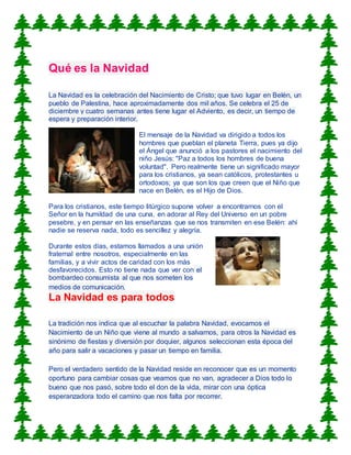 La Navidad conmemora el nacimiento de Jesucristo en Belén hace aproximadamente 2000 años. Durante las cuatro semanas previas al 25 de diciembre, los cristianos participan en el Adviento para prepararse espiritualmente. La Navidad transmite un mensaje de paz y buena voluntad para toda la humanidad aunque también tiene un significado especial para los cristianos que creen que Jesús era el Hijo de Dios.