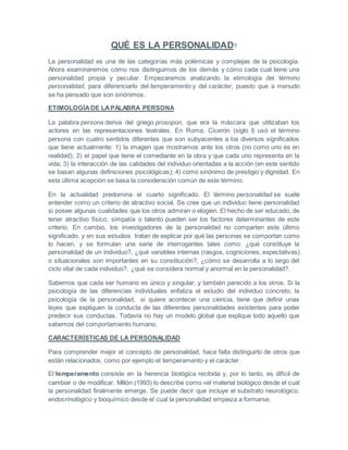 El documento explica la personalidad como una categoría psicológica compleja que surge de la interacción entre la herencia y el ambiente. Se diferencia de conceptos como el temperamento y el carácter. Examina las etimologías de los términos "persona" y "personalidad" y cómo han evolucionado sus significados. También describe teorías como la de los rasgos y tipos de personalidad, incluyendo una lista de ocho tipos comunes.