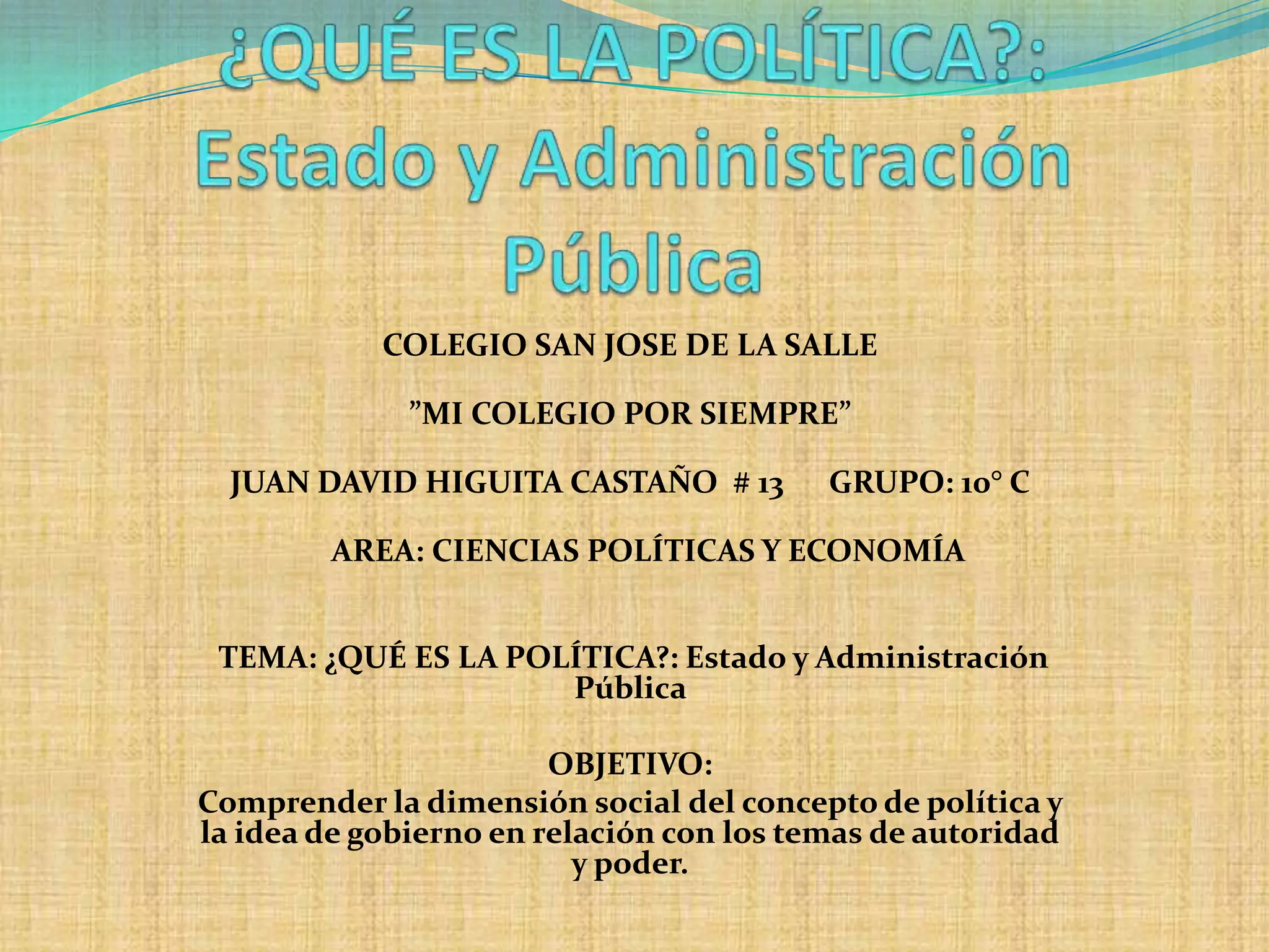 Este documento trata sobre el tema de la política y la administración pública. Explica conceptos clave como Estado, política y gobierno. Define la política como el arte de gobernar y señala que su objetivo es la promoción del bien común. Describe las funciones del Estado y las tres ramas en las que se divide el poder político. Finalmente, hace referencia a la administración pública y su relación con las instituciones gubernamentales.
