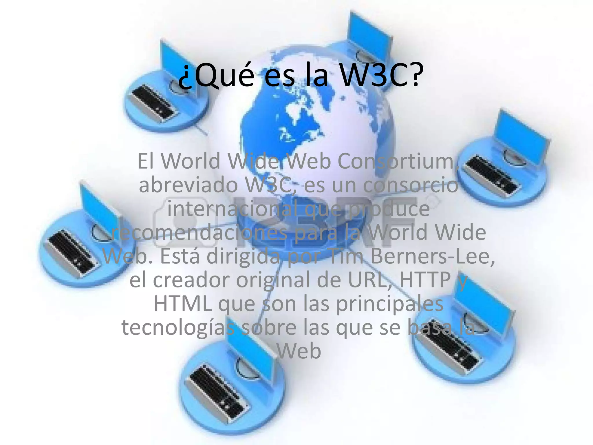 El W3C es un consorcio internacional que produce recomendaciones para la World Wide Web y está dirigido por Tim Berners-Lee, el creador original de URL, HTTP y HTML. HTTP utiliza el puerto 80 mientras que HTTPS utiliza el puerto 443 y proporciona cifrado y certificados. Los protocolos de seguridad definen las reglas para comunicaciones seguras. DNS traduce nombres de dominio a direcciones IP y viceversa para facilitar la navegación a los humanos.