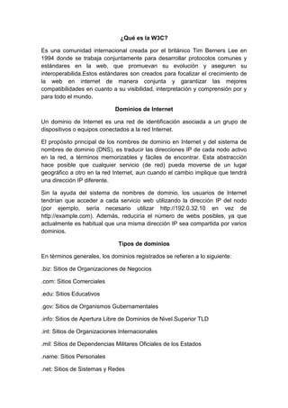 La W3C es una organización internacional creada en 1994 para desarrollar estándares y protocolos comunes para la web que promuevan su evolución y aseguren su interoperabilidad. Un dominio de internet es una red de identificación asociada a equipos conectados a internet, y el propósito del sistema de nombres de dominio es traducir las direcciones IP a términos más fáciles de recordar. Los protocolos de seguridad como SSH, IPsec y PPTP establecen reglas para comunicaciones seguras mediante el manejo de claves, conf
