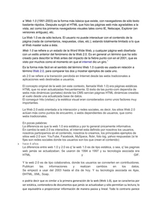 La Web 1.0 se refiere a una web estática con documentos que no se actualizaban, mientras que la Web 2.0 es más dinámica e interactiva, permitiendo que los usuarios creen y compartan contenido entre sí. Algunos ejemplos representativos de la Web 2.0 son Google, Wikipedia, eBay y YouTube, donde los usuarios juegan un papel fundamental al aportar contenido que aumenta el valor de la plataforma.