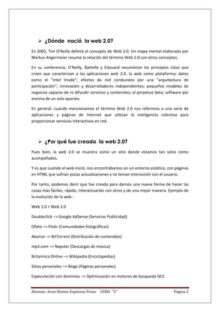 El documento resume los conceptos clave de la Web 2.0, incluyendo su evolución desde la Web 1.0, los principios que la caracterizan como mayor interactividad y participación de los usuarios, y su creador Tim O'Reilly. También discute brevemente los aspectos positivos como mayor acceso a la información y negativos como la sobrecarga de datos.