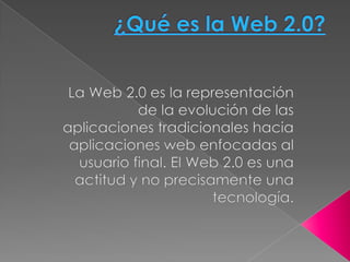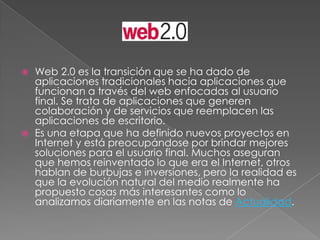 Web 2.0 se refiere a la transición de aplicaciones tradicionales de escritorio a aplicaciones basadas en la web enfocadas en el usuario final, que fomentan la colaboración y reemplazan aplicaciones de escritorio. Se originó en 2004 cuando Dale Dougherty acuñó el término para describir la evolución de sitios web hacia aplicaciones más interactivas y centradas en el usuario. Algunos principios clave de Web 2.0 incluyen tener la web como plataforma, usar contenido generado por los usuarios para impulsar la innovación y