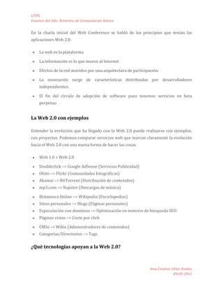 La Web 2.0 representa la evolución de las aplicaciones tradicionales a aplicaciones web enfocadas en el usuario final que fomentan la colaboración a través de servicios en línea. Surge de la transición de aplicaciones de escritorio a aplicaciones basadas en la web con funcionalidades mejoradas. No es una tecnología en sí, sino una actitud de desarrollo centrada en el usuario que utiliza tecnologías como Ajax, redes sociales y APIs.