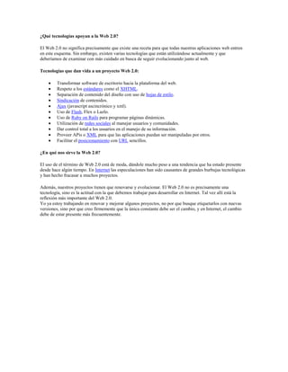 La Web 2.0 representa la evolución de las aplicaciones tradicionales a aplicaciones web enfocadas en el usuario final que fomentan la colaboración. Surge de la transición de aplicaciones de escritorio a aplicaciones en la web con funcionalidades como wikis y blogs. No es una tecnología en sí, sino una actitud enfocada en el usuario final y en evolucionar constantemente.