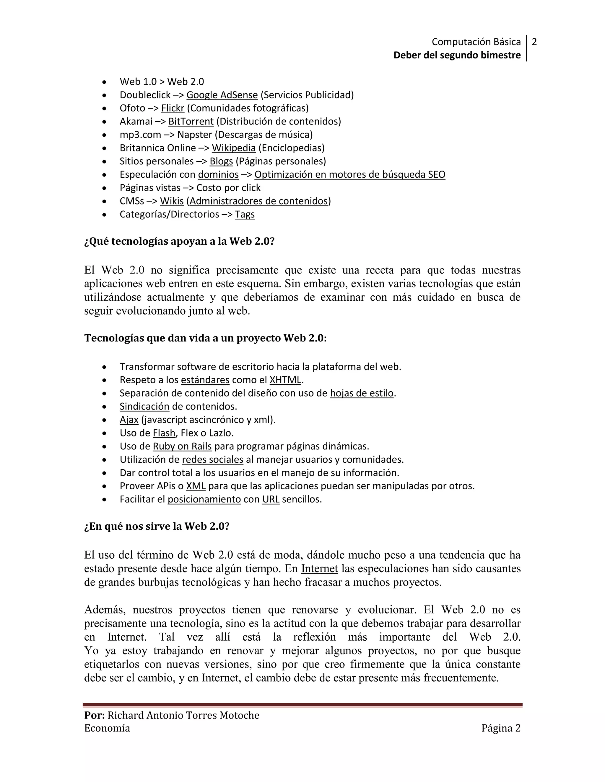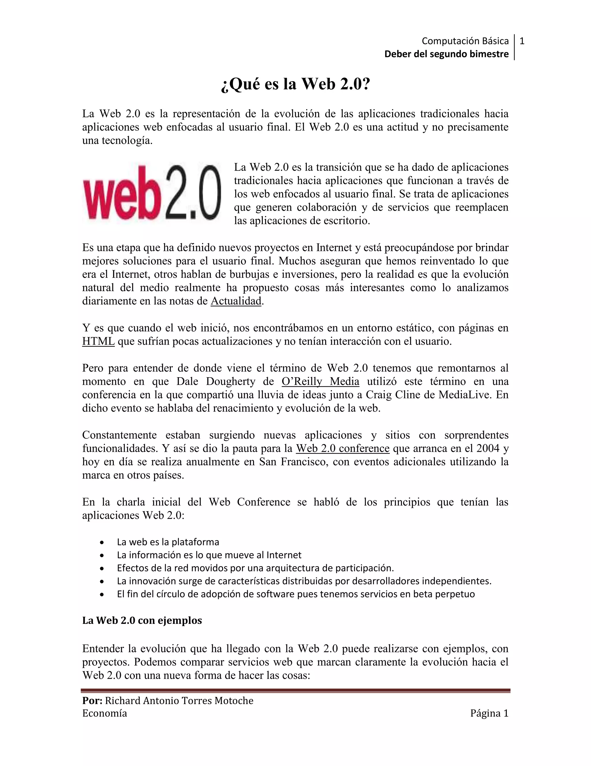 La Web 2.0 representa la evolución de las aplicaciones tradicionales a aplicaciones web enfocadas en el usuario final que fomentan la colaboración. Surge de la transición de aplicaciones de escritorio a aplicaciones en la web con funcionalidades como Flickr y Wikipedia. Tecnologías como Ajax y redes sociales apoyan a la Web 2.0 al dar control a los usuarios y facilitar el intercambio de información.