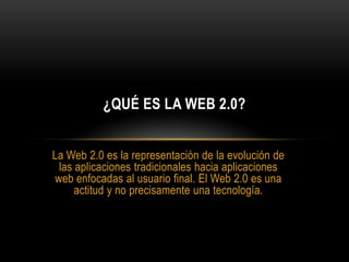 La Web 2.0 representa la evolución de las aplicaciones tradicionales a aplicaciones web enfocadas en el usuario final, caracterizadas por fomentar la colaboración y reemplazar aplicaciones de escritorio. Se trata de una actitud más que una tecnología, que convierte a la Web en una plataforma funcional, simple y ligera para transferir información y servicios de forma social y flexible.