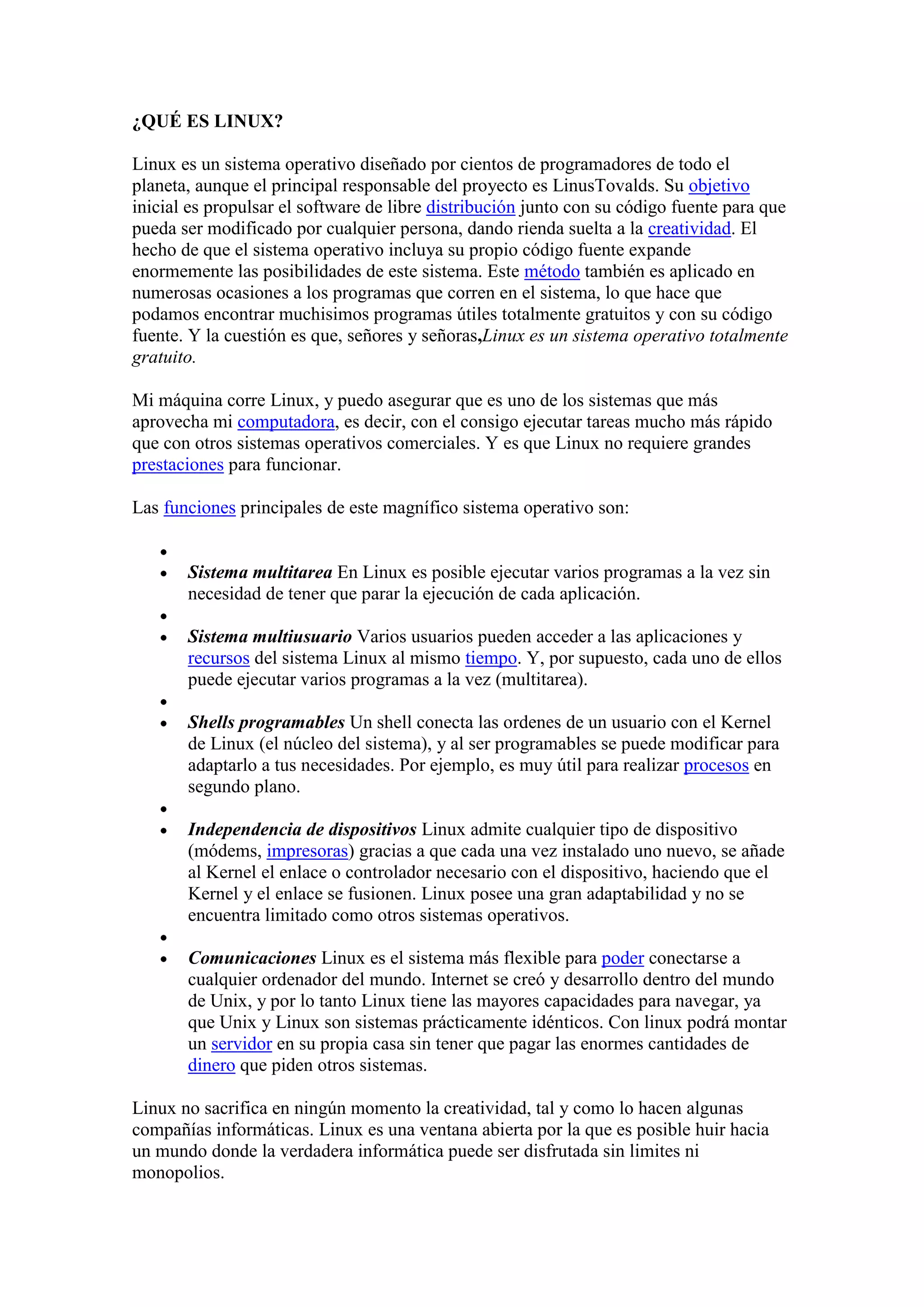 Linux es un sistema operativo de código abierto desarrollado por cientos de programadores alrededor del mundo y liderado por Linus Torvalds, que tiene como objetivo promover el software libre. Linux es gratuito, permite ejecutar múltiples tareas y usuarios simultáneamente, y es adaptable a diferentes dispositivos.