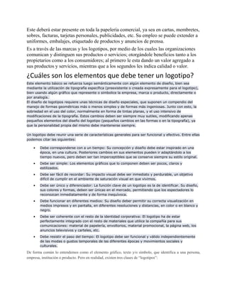 El logotipo identifica entidades públicas o privadas de forma gráfica. Sirve para reconocer fácilmente una empresa o institución y asociar sus productos o servicios. Un buen logotipo debe ser simple, fácil de recordar, único y funcional en diferentes medios. Representa la identidad de una marca y debe resistir el paso del tiempo.