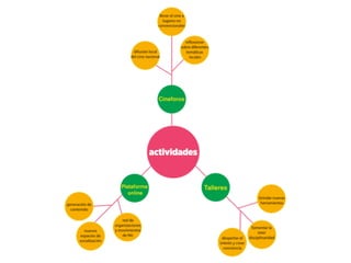 Este documento describe varias iniciativas culturales en Nicaragua que utilizan medios digitales para promover el debate, generar contenido y difundir proyectos. Incluye la creación de cineforos y talleres sobre temas como derechos humanos y violencia de género, así como talleres de ilustración, serigrafía y seguridad digital. También cubre la gestión de eventos culturales y la planificación de comunicaciones y recursos para iniciativas culturales.