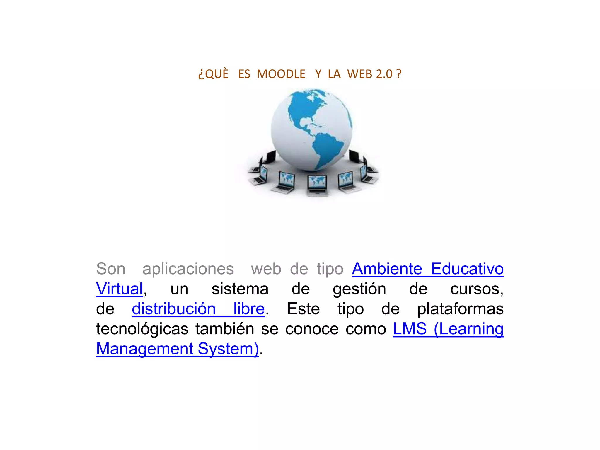 Este documento describe Moodle y la Web 2.0 como aplicaciones web de tipo Ambiente Educativo Virtual que permiten a los docentes crear comunidades de aprendizaje en línea, realizar evaluaciones interactivas, y complementar el aprendizaje presencial de una manera sencilla y compatible con cualquier navegador. Además, destaca la importancia de las tecnologías de la información y la comunicación como medios adecuados para la comunicación asíncrona y sincrónica entre estudiantes y tutores.
