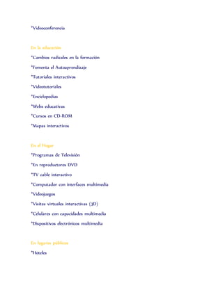El documento habla sobre multimedia y describe sus características principales. La multimedia combina diferentes medios como texto, imágenes, sonido y video para transmitir información de forma interactiva. Se usa en negocios, educación e incluso en el hogar. Algunos programas populares de multimedia son Active GIF Creator para crear GIF animados, Image Constructor para crear ilustraciones, y Easy Watermark Creator y Easy Frame Creator para agregar marcas de agua y marcos a imágenes.