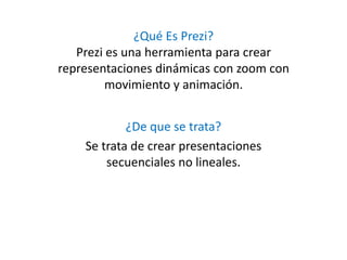 Prezi es una herramienta para crear presentaciones dinámicas no lineales utilizando zoom y movimiento. Permite agregar texto, imágenes y videos para crear representaciones interactivas que pueden ser compartidas en línea o descargadas para presentaciones sin conexión. Ofrece diferentes planes de suscripción con diferentes niveles de almacenamiento en la nube y funciones.