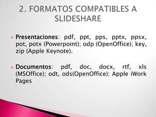 Slideshare es un programa que permite subir presentaciones como PowerPoint y ver las de otros usuarios. Los archivos se pueden descargar si se tiene una cuenta. Slideshare acepta presentaciones y documentos en formatos como PDF, PPT, DOC y otros. Los usuarios pueden subir archivos seleccionándolos en el navegador, indicando si son públicos, privados o solo para amigos. Slideshare es útil para estudiantes y profesores para compartir y acceder a material desde cualquier lugar.