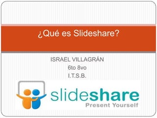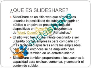 SlideShare es un sitio web que permite a los usuarios subir y compartir presentaciones de diapositivas, documentos de Word y PDF. Los usuarios pueden ver presentaciones subidas por otros, añadir comentarios y compartir el contenido. SlideShare se lanzó en 2006 y actualmente recibe 12 millones de visitas al mes, siendo adquirido por LinkedIn en 2012.