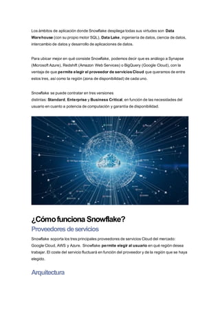 Snowflake es una plataforma en la nube que resuelve el problema de los silos de datos al proporcionar un repositorio común de datos accesible desde cualquier nodo. Funciona mediante una arquitectura de tres capas que almacena, procesa y gestiona los datos de forma escalable e integrada con los principales proveedores de nube. Snowflake ofrece ventajas como proteger al cliente de un único proveedor, simplificar la gestión de datos y permitir un acceso democratizado a los mismos mediante SQL.