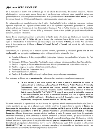 Un acto escolar es una herramienta educativa que busca exaltar valores y reflexionar sobre la historia política a través de la participación de toda la comunidad educativa. Se estructura en diferentes protocolos y momentos ceremoniales, donde se combinan discursos de docentes y alumnos. Además, se propone democratizar las prácticas escolares para fomentar un diálogo participativo y un cambio en la percepción tradicional del rol del estudiante.