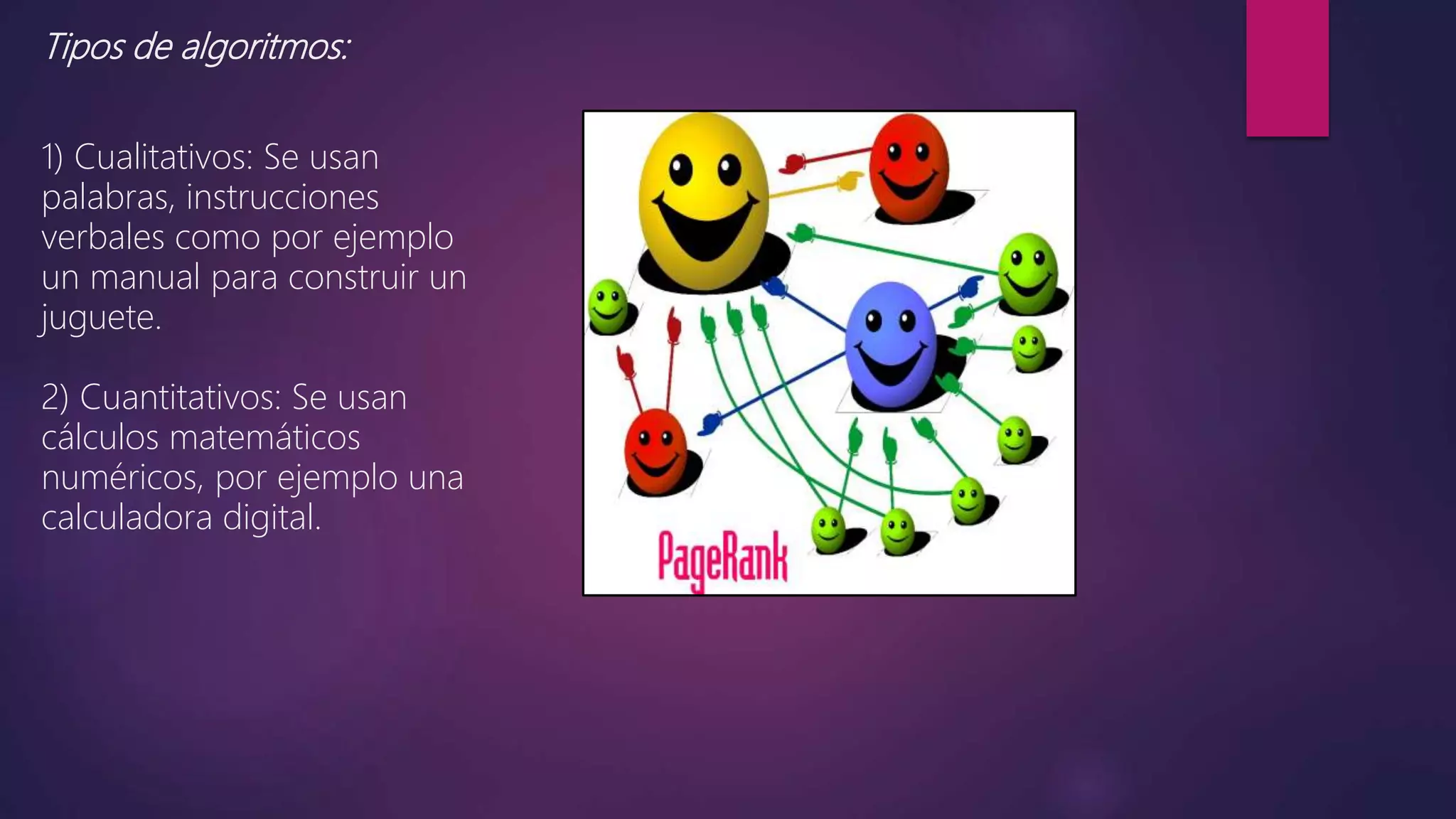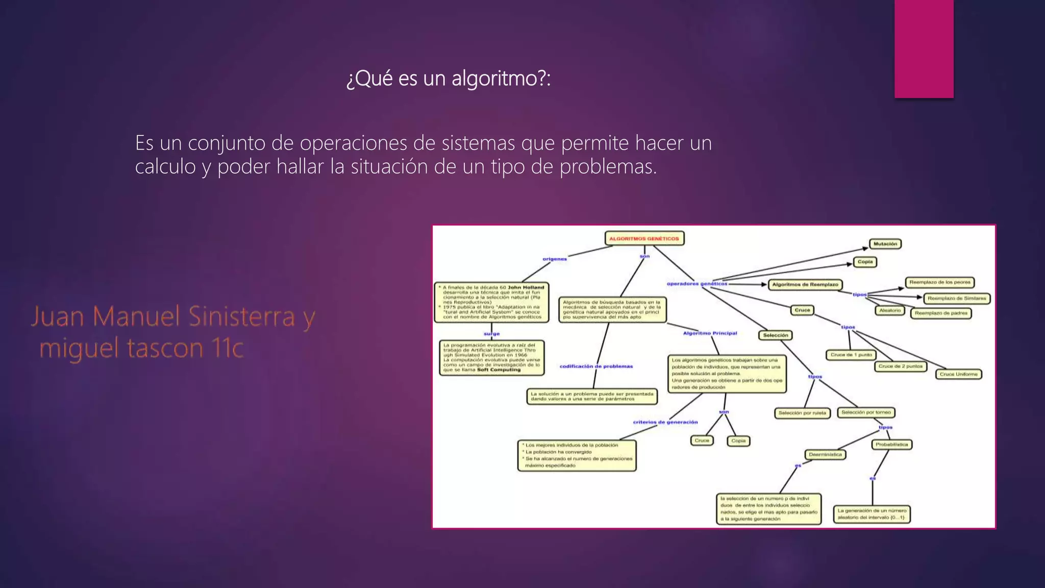 Este documento define conceptos clave relacionados con algoritmos y programación informática. Explica que un algoritmo es un conjunto de pasos para resolver un problema, y describe tipos de algoritmos como cualitativos y cuantitativos. También cubre características como ser finito, definido y preciso, así como lenguajes algorítmicos como lenguaje natural, diagramas de flujo y pseudocódigo.