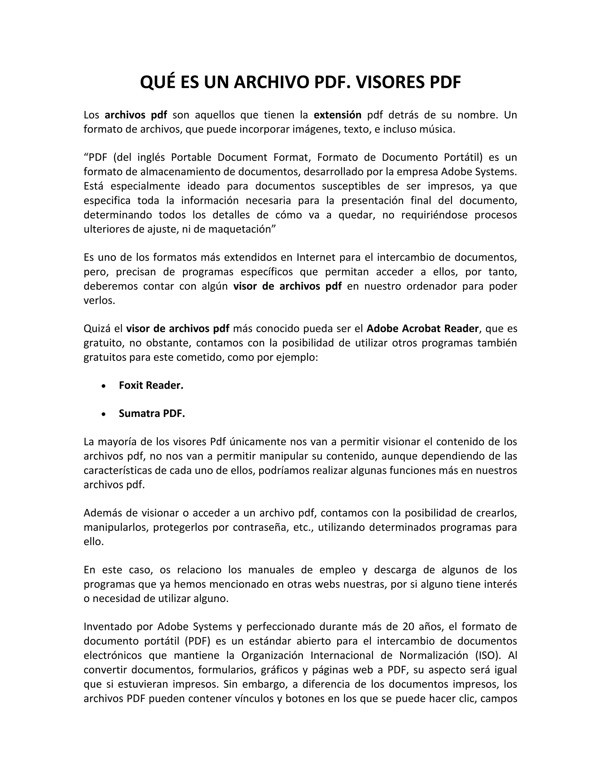 Un archivo PDF es un formato de archivo diseñado para preservar la presentación de un documento independientemente del software, hardware y sistema operativo. Los archivos PDF son ampliamente utilizados para compartir documentos en forma confiable debido a que mantienen exactamente el mismo aspecto que los originales. Para ver archivos PDF, se necesita un visor PDF como Adobe Acrobat Reader, el cual es gratuito y permite ver y firmar archivos PDF de forma multiplataforma.
