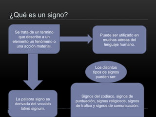 Este documento define y explica varios tipos de códigos, signos, iconos y símbolos. Explica que un código es un sistema de signos que transmite ideas, mencionando ejemplos como códigos verbales, telegráficos, sociales, informáticos y biológicos. Define un signo como un elemento, fenómeno o acción material que puede ser usado en diferentes áreas del lenguaje humano. Explica que un icono es una imagen o representación que sustituye a un objeto de forma analógica o simbólica,