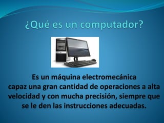 Este documento describe las partes principales de un computador. Explica que el hardware incluye componentes electrónicos y mecánicos como el teclado, monitor, discos duros y tarjetas. El software son programas como Windows y Office. Un computador consta de una unidad central de procesamiento, dispositivos de entrada y salida, y dispositivos de almacenamiento como discos duros.