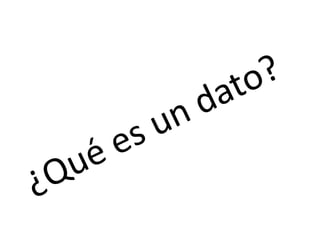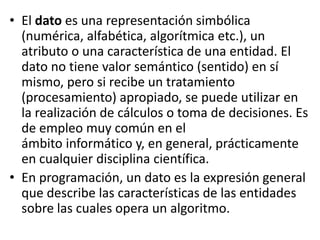 Un dato es una representación simbólica que carece de significado por sí misma pero que puede procesarse para ser útil en cálculos o decisiones. La información, a diferencia de los datos, tiene estructura que modifica las interacciones con el entorno. Un sistema de información es un conjunto de elementos como personas, datos y recursos que interactúan para procesar datos y distribuir información de forma útil según los objetivos de una organización.