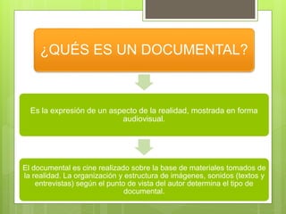 Un documental es una expresión de la realidad capturada en formato audiovisual. Se basa en material tomado directamente de la vida real y lo organiza y estructura según la perspectiva del cineasta para informar o educar sobre un tema. Los temas comunes incluyen ciencia, historia, educación e información. La tecnología, como cámaras y sonido portátiles, revolucionó el género en las décadas de 1950 y 1960 al permitir entrevistas en locaciones reales. La BBC adoptó el documental como un género propio