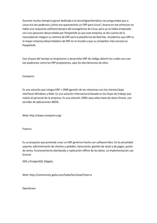 Los sistemas ERP (Enterprise Resource Planning) son sistemas de gestión de información que integran y automatizan muchos de los procesos operativos de una empresa. Existen varios ERP de código abierto como Compiere, Openbravo y TinyERP que ofrecen funcionalidades similares a los ERP propietarios pero son gratuitos y de código abierto.