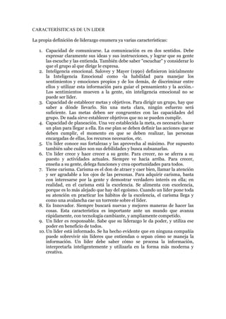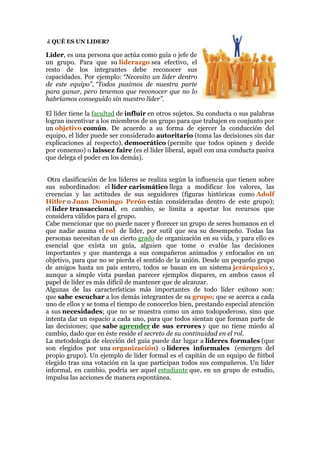 Un líder es una persona que guía o dirige a un grupo. Para ser efectivo, los demás miembros del grupo deben reconocer sus capacidades de liderazgo. Existen diferentes estilos de liderazgo como el autoritario, democrático o laissez-faire. Además, los líderes pueden clasificarse como carismáticos o transaccionales según su influencia sobre los subordinados. Un grupo necesita un líder, ya sea formal o informal, que tome decisiones, mantenga a los miembros enfocados y evite que pierdan el sentido