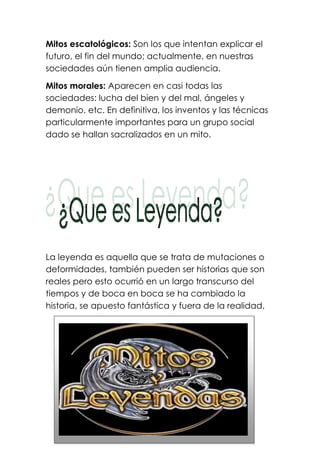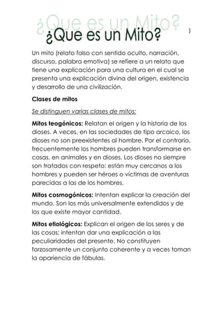 Los mitos son relatos que ofrecen explicaciones culturales sobre el origen y desarrollo de una civilización desde una perspectiva divina. Existen varios tipos de mitos, incluyendo mitos teogónicos sobre el origen de los dioses, mitos cosmogónicos sobre la creación del mundo, mitos etiológicos sobre el origen de seres y cosas, y mitos morales sobre temas como el bien y el mal. Las leyendas son historias que originalmente podrían haber sido reales pero con el tiempo se han modificado y agregado elementos fantásticos