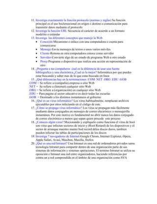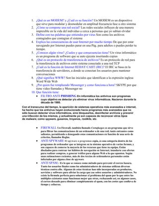 El documento contiene preguntas y respuestas sobre varios temas relacionados con la tecnología e Internet. Explica conceptos como MODEM, virus informáticos, protocolos de transferencia de archivos, navegadores web y redes sociales. También describe funciones de software como antivirus, firewalls y filtros anti-spam, así como diferencias entre terminaciones de dominios como .com, .edu y .gov.