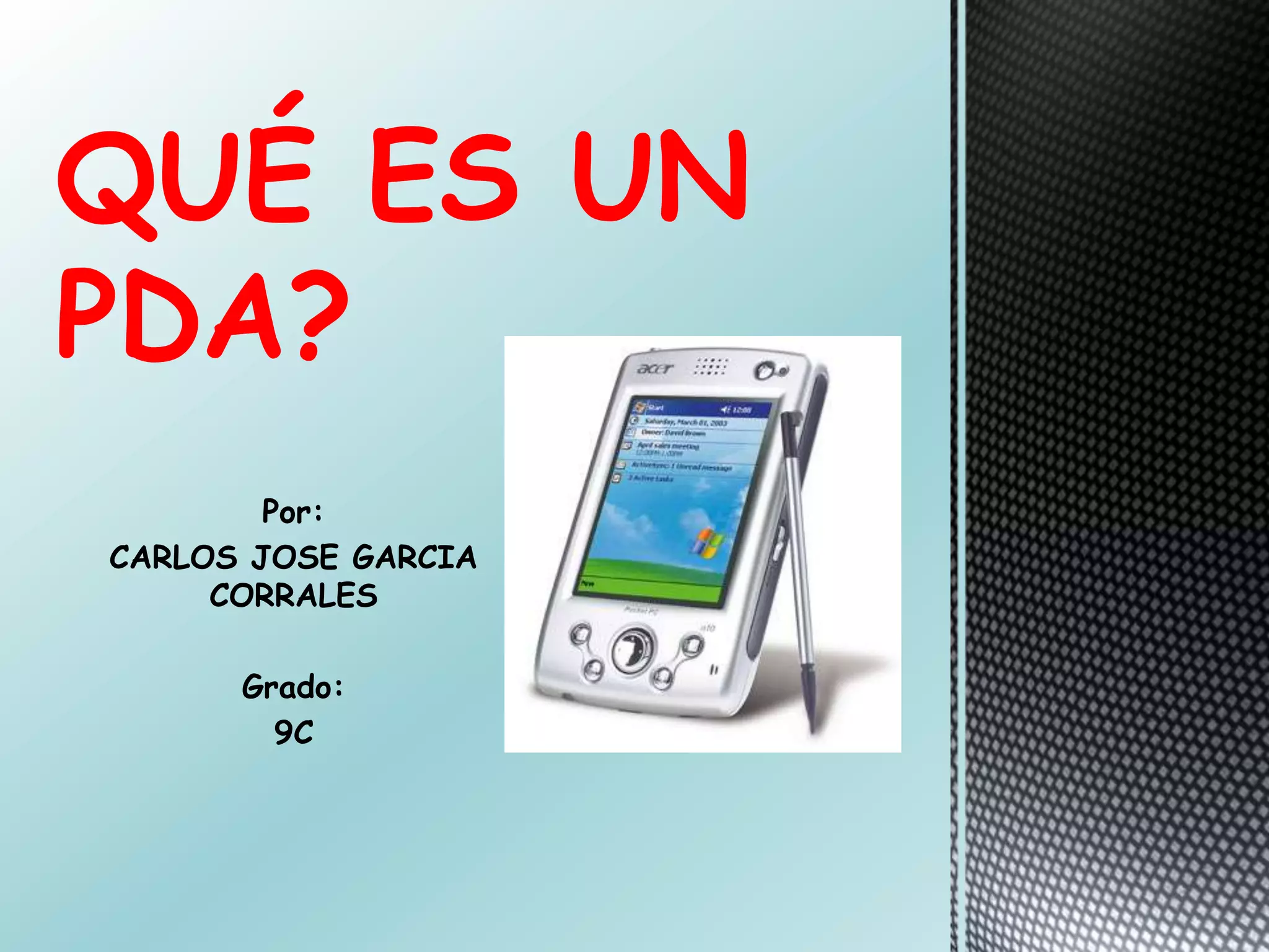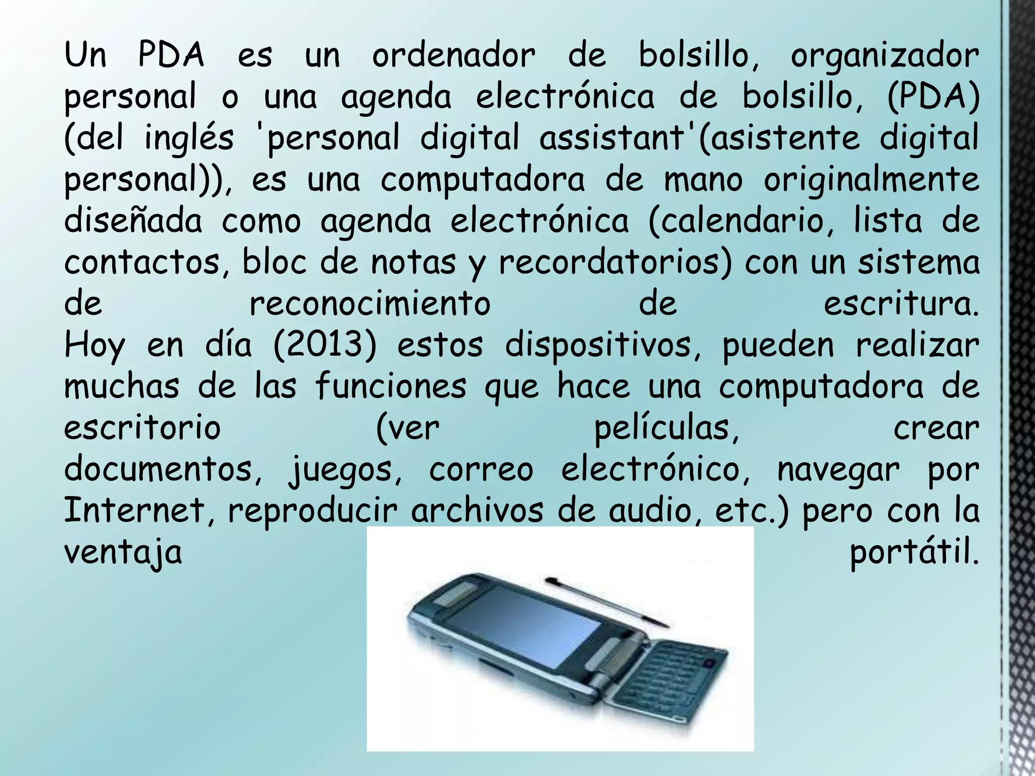 Un PDA es un ordenador de bolsillo que originalmente fue diseñado como una agenda electrónica pero que hoy en día puede realizar muchas de las funciones de una computadora de escritorio de forma portátil. El primer PDA fue el Apple Newton en 1992. En 1995, la compañía Palm popularizó los PDA con su Palm Pilot. Los PDA se han vuelto menos comunes con el advenimiento de los smartphones inteligentes.