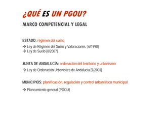 El documento explica qué es un Plan General de Ordenación Urbana (PGOU). Un PGOU es el principal instrumento de planeamiento urbanístico a nivel municipal. Regula el uso y desarrollo del suelo y establece directrices para las futuras actuaciones en la ciudad. Los ciudadanos pueden participar mediante la presentación de alegaciones durante los períodos de exposición pública del plan.