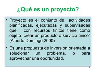 Este documento describe los conceptos básicos de un proyecto. Define un proyecto como un conjunto de actividades planificadas y supervisadas con recursos finitos para crear un producto o servicio único. Explica las diferencias entre un proyecto y un proceso, y describe las fases típicas de un ciclo de gestión de proyectos, incluida la identificación, preparación, ejecución, operación y mantenimiento y evaluación. Finalmente, discute cómo se pueden clasificar y identificar ideas para proyectos.