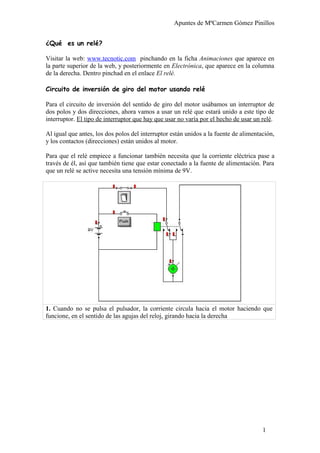 Este documento explica qué es un relé y cómo funciona en diferentes circuitos eléctricos. Describe un circuito básico de inversión del giro de un motor usando un relé y un interruptor de dos posiciones. Luego explica cómo usar un relé de enganche para mantener el relé activado después de soltar el interruptor. Finalmente, aplica un circuito de relé de enganche para automatizar la apertura y cierre de una puerta de garaje y como circuito de seguridad para controlar una máquina eléctrica de corriente alter