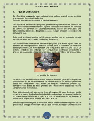 El documento describe los diferentes tipos de servidores y cómo funcionan. Explica que un servidor es un programa o dispositivo que proporciona recursos e información a otros dispositivos llamados clientes. Luego detalla los diferentes tipos de servidores como servidores web, de correo, de bases de datos y más. También describe cómo los servidores grandes se alojan en salas de servidores especializadas mientras que los pequeños pueden estar en oficinas normales. Finalmente, explica que el servidor web Apache es el más utilizado y las ventajas de instalarlo