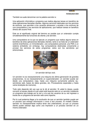 El documento describe los diferentes tipos de servidores y cómo funcionan. Explica que un servidor es un software o hardware que provee recursos y servicios a otros dispositivos llamados clientes. Menciona algunos tipos comunes de servidores como servidores web, de correo y bases de datos. También describe cómo los servidores pueden estar ubicados en una sala especial o en las oficinas, dependiendo del tamaño de la empresa.